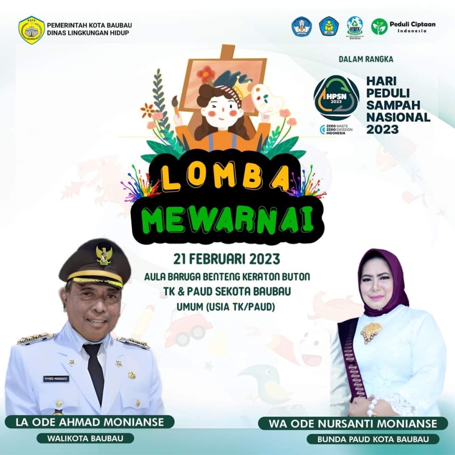 BAUBAU, GAGASSULTRA.COM - Dalam Rangka Memperingati Hari Peduli Sampah Nasional (HPSN) tahun 2023, Pemerintah kota Baubau yang dikoordinir Dinas lingkungan Hidup yang menggandeng Bunda PAUD, Dinas Pendidikan dan Kebudayaan Kota Baubau melalui bidang pembinaan PAUD, Peduli Ciptaan Indonesia dan Sukarelawan hijau Baubau menyelenggarakan lomba mewarnai untuk anak PAUD dan Taman Kanak Kanak se-Kota Baubau.
