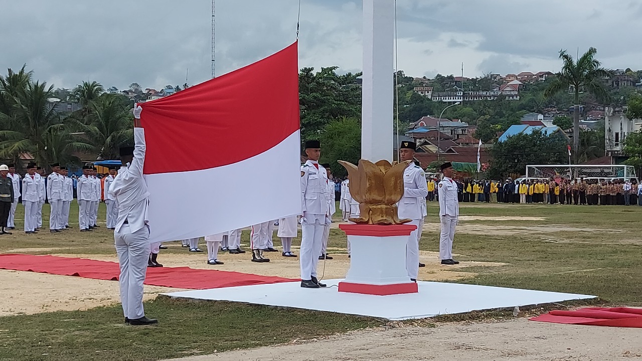 Pasukan pengibar bendera (paskibra) Kota Baubau saat mengibarkan bendera saat peringatan HUT RI ke-77 tingkat Kota Baubau