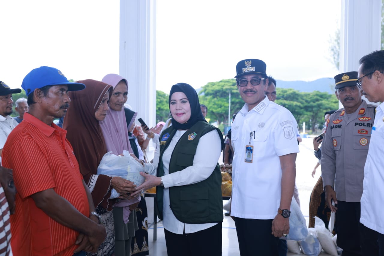 Kadis Perindag Sultra, Hj Sitti Saleha bersama Pj bupati Bombana menyerahkan secara simbolis kepada warga di pasar murah