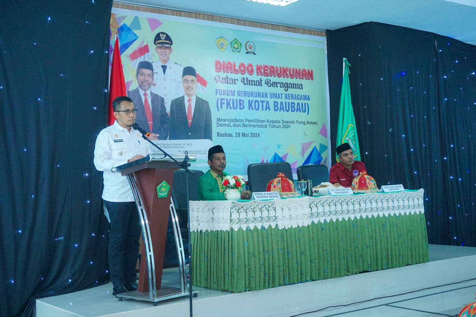 Keinginan untuk mewujudkan Pilkada sukses dengan aman, damai dan bermartabat diungkapkan Pj Wali Kota Baubau Dr Muh Rasman Manafi, SP, M.Si saat memberikan sambutan pada kegiatan Dialog Kerukunan antar umat beragama (FKUB) dengan tema mewujudkan pemilihan kepala daerah yang aman, damai dan bermartabat di Kantor Kementerian Agama RI Baubau Rabu (29/05/2024).