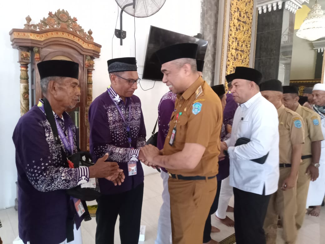 Pj Bupati Buteng H Kostantinus Bukide menyalami JCH Buteng yang dilepas di Masjid Agung Nurul Huda, Lakudo