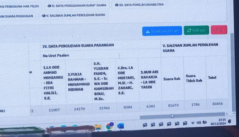 Keunggulan pasangan Yusran-Hamsina berdasarkan rapat pleno terbuka rekapitulasi hasil perhitungan suara Pilwali Baubau tahun 2024 yang di gelar Komisi Pemilihan Umum (KPU) di salah satu hotel di Kota Baubau, selasa (03/12/2024).
