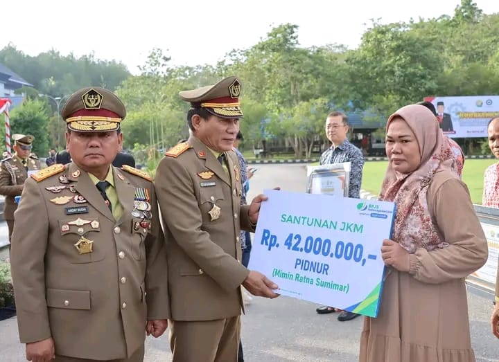 Pj Gubernur Sultra, Andap Budhi Revianto saat menyaksikan penyerahan santunan oleh Kadis Transnaker, Sultra, Lm Ali Haswandy kepada salah satu penrima santunan JKM