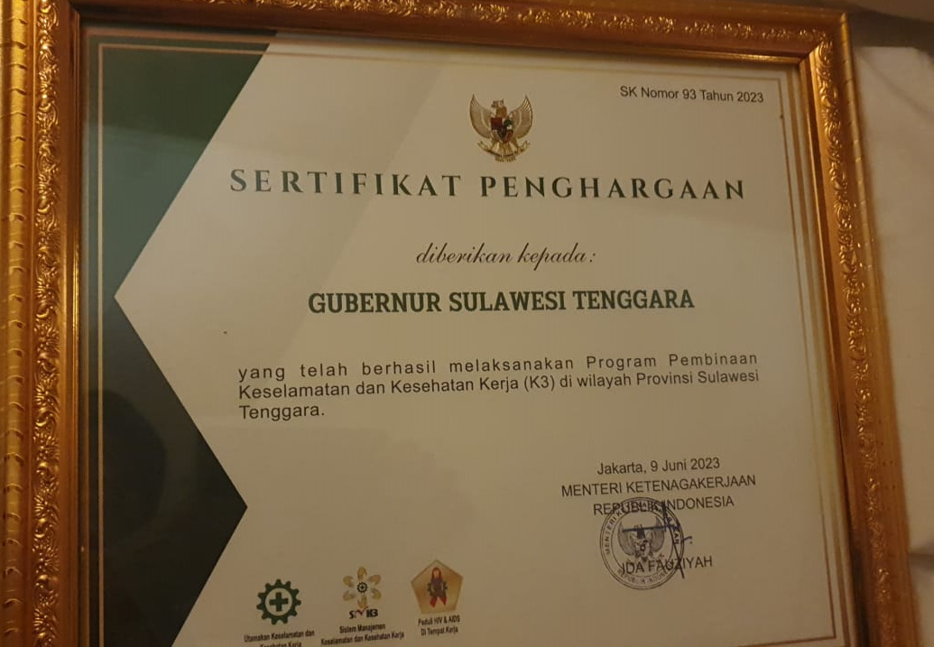 Kepala Bidang (Kabid) Pengawasan Dinas Transnaker Sultra, Asniar kepada Gagassultra via telepon mengatakan, pemberian penghargaan K3 tersebut diberikan kepada Gubernur Sutra, Ali Mazi,SH setelah berhasil melaksanakan pembinaan Keselamatan dan Kesehatan Kerja (K3) di wilayah Sulawesi Tenggara.